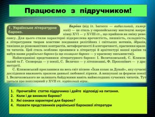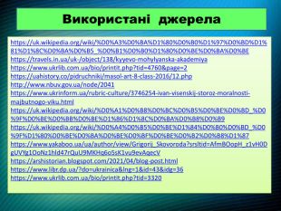 Використані джерелаhttps://uk.wikipedia.org/wiki/%D0%A3%D0%BA%D1%80%D0%B0%D1%97%D0%BD%D1%81%D1%8 C%D0%BA%D0%B5_%D0%B1%D0%B0%D1%80%D0%BE%D0%BA%D0%BEhttps://travels.in.ua/uk-/object/138/kyyevo-mohylyanska-akademiyahttps://www.ukrlib.com.ua/bio/printit.php?tid=4760&page=2https://uahistory.co/pidruchniki/masol-art-8-class-2016/12.phphttp://www.nbuv.gov.ua/node/2041https://www.ukrinform.ua/rubric-culture/3746254-ivan-visenskij-storoz-moralnosti-majbutnogo-viku.htmlhttps://uk.wikipedia.org/wiki/%D0%A1%D0%B8%D0%BC%D0%B5%D0%BE%D0%BD_%D0%9 F%D0%BE%D0%BB%D0%BE%D1%86%D1%8 C%D0%BA%D0%B8%D0%B9https://uk.wikipedia.org/wiki/%D0%A4%D0%B5%D0%BE%D1%84%D0%B0%D0%BD_%D0%9 F%D1%80%D0%BE%D0%BA%D0%BE%D0%BF%D0%BE%D0%B2%D0%B8%D1%87https://www.yakaboo.ua/ua/author/view/Grigorij_Skovoroda?srsltid=Afm. BOop. H_z1v. H0 Dg. UVYg1 Oo. Nz1hld47r. Qu. U9 MKHq6o5s. K1vu9ev. Aqec. Vhttps://arshistorian.blogspot.com/2021/04/blog-post.htmlhttps://www.libr.dp.ua/?do=ukrainica&lng=1&id=43&idg=36https://www.ukrlib.com.ua/bio/printit.php?tid=3320