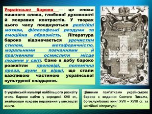 Українське бароко — це епоха пишного слова, глибокої духовності й яскравих контрастів. У творах цього часу поєднуються релігійні мотиви, філософські роздуми та емоційна образність. Література бароко відзначається урочистим стилем, метафоричністю, моральними повчаннями й прагненням осмислити місце людини у світі. Саме в добу бароко розквітли проповіді, полемічна проза, думи та вірші, що стали важливою частиною української культурної спадщини. Цінними пам’ятками українського бароко є видання Святого Письма, богослужбових книг XVII – XVIII ст. та житійної літератури. В українській культурі найбільшого розквіту стиль бароко набув у середині XVII ст., знайшовши яскраве вираження у мистецтві книги.