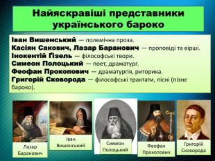 Найяскравіші представники українського барокоІван Вишенський — полемічна проза. Касіян Сакович, Лазар Баранович — проповіді та вірші.Інокентій Ґізель — філософські твори. Симеон Полоцький — поет, драматург. Феофан Прокопович — драматургія, риторика. Григорій Сковорода — філософські трактати, пісні (пізнє бароко).Іван Вишенський Лазар Баранович Симеон Полоцький Феофан Прокопович Григорій Сковорода