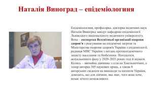 Наталія Виноград – епідеміологиня. Епідеміологиня, професорка, докторка медичних наук Наталія Виноград завідує кафедрою епідеміології Львівського національного медичного університету. Вона – експертка Всесвітньої організації охорони здоров'я з реагування на епідемічні загрози та Міністерства охорони здоров'я України з епідеміології, радниця МНС України з питань протиепідемічного захисту населення та біобезпеки. Погодьтеся, актуальнішого фаху у 2020-2021 роках годі й шукати. Колись – звичайна дівчинка з села на Хмельниччині, а тепер авторка 305 наукових праць, а також 8 авторських свідоцтв на винаходи та патентів України, доводить, що для дівчини, яка знає, чого вона хоче, немає нічого неможливого.