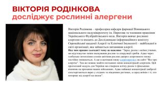 ВІКТОРІЯ РОДІНКОВАдосліджує рослинні алергени. Вікторія Родінкова – професорка кафедри фармації Вінницького національного медуніверситету ім. Пирогова та членкиня правління Українського Фулбрайтівського кола. Вікторія вивчає рослинні алергени та входить до Дослідницько-інформаційного комітету Європейської академії Алергії та Клінічної Імунології – найбільшої в світі організації, яка займається питаннями алергії. Над чим працює сьогодні і чому це важливо: “Зараз, разом з моїми учнями, ми відстежуємо зміни пилкування рослин та споруляції грибів. Адже через глобальне потепління сезони цвітіння рослин-джерел алергенного пилку постійно змінюються. А ще я щотижня пишу алергопрогноз на сайті “Все про алергію”. Там же можна знайти погодинні зміни концентрацій алергенів. Цей прогнозний модуль для України ми створили влітку разом із фінськими вченими на прохання наших військових. Адже найвищі концентрації амброзії спостерігаються якраз у східних та південних регіонах, а серед воїнів є ті, хто потерпає від алергії на пилок”.