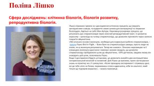 Поліна Лішко. Сфера досліджень: клітинна біологія, біологія розвитку, репродуктивна біологія. Лішко отримала премію за «дослідження клітинних процесів, що керують заплідненням ссавців, та відкриття нових шляхів для контрацепції та лікування безпліддя», йдеться на сайті Мак-Артура. Науковиця розкриває процеси, що регулюють рух сперматозоїдів через жіночий репродуктивний тракт, та розвиток акросому – органоїду на голівці сперматозоїда, що дозволяє проникати через захисне покриття яйцеклітини. «Ми описали основні молекули, необхідні для нормальної роботи сперматозоїдів, – казала Лішко Bird in Flight. – Вони були на сперматозоїдах завжди, просто люди не знали, як ці молекули регулюються. Тепер ми знаємо». Описана науковицею та її командою молекула одночасно «вмикає» режим свердла, що дозволяє сперматозоїду пробурювати шлях до яйцеклітини, і GPS-датчиком, завдяки якому він знаходить цей шлях, пояснювала Лішко. Якщо її дослідження будуть успішними, це дозволить винайти два контрацептиви: негормональний жіночий та чоловічий. Для Лішко це важливо, проте застосування знань на практиці не є її самоціллю. «Коли проводиш експеримент і отримуєш дані, які до тебе ніхто не бачив, переживаєш сплеск адреналіну, ніби ти альпініст, який тільки що підкорив вершину», – казала науковиця.