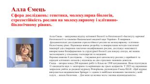 Алла Ємець. Сфера досліджень: генетика, молекулярна біологія, стресостійкість рослин на молекулярному і клітинно-біологічному рівнях. Алла Ємець – завідувачка відділу клітинної біології та біотехнології «Інституту харчової біотехнології та геноміки Національної академії наук України». Її напрямок – фундаментальні дослідження стресостійкості рослин на молекулярному і клітинно-біологічному рівні. Науковиця вивчає розробку та використання методів генетичної інженерії для створення генетично модифікованих рослин, досліджує можливості використання біоінформатики та структурної біології для пошуку сполук, які можна застосовувати у сільському господарстві та медицині. Наукова новизна її досліджень – зʼясування ролі цитоскелету рослин у сприйнятті та передачі клітинних сигналів у відповідь на дію стресових чинників довкілля. Ємець – авторка понад 200 наукових робіт із більш як 1500 цитуваннями. Вона підготувала 11 кандидатів наук і є менторкою та керівницею ще трьох аспірантів. У 2023-му науковицю запросили увійти до редакції журналу Protoplasma, розповідала Ємець ELLE. «Цей журнал випускається видавництвом Springer і є одним із найбільш впливових часописів у моїй галузі, – казала біологиня. – Для мене це велика честь і велика відповідальність».