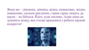 Сприяти формуванню толерантного ставлення до жінок та дівчат у науці, сформувати розуміння важливості розвитку науки та рівного доступу до неї, мотивувати здобувачів освіти до участі у науководослідній діяльності.