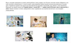 Втім, гендерні програми останніх років роблять свою справу: все більше молодих жінок обирають для себе технічні спеціальності і шлях в науці, про розробки жінок-вчених почали розповідати в усьому світі. Українські жінки теж ніколи не відставали від світових тенденцій, нам дійсно є чим пишатись. Причому на даний момент в Україні жінок у науці 46% — майже вдвічі більше, ніж в середньому у світі. Значно менше за своїх закордонних колег українські дослідниці жаліються і на гендерні упередження.