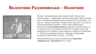 Валентина Радзимовська – біологиня. Одним з найвидатніших імен нашої історії є Валентина Радзимовська – професорка, докторка медичних і фізіологічних наук, засновниця української школи фізіологів і біохіміків, а до того ж – громадська діячка. За політичну діяльність та участь у Спілці визволення України у 1930-х роках Валентина Радзимовська була репресована радянською владою. Втім, це не завадило їй стати авторкою понад 60-ти праць із біохімії, патофізіології, педіатрії, психоневрології, фізіології, фтизіатрії. У 1945 році науковиця виїхала з України, емігрувавши спочатку до Німеччини, а потім – до США. Радзимовська внесла величезний вклад у вивчення туберкульозу і лікування його у дітей.