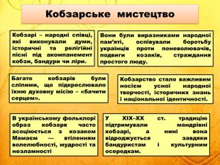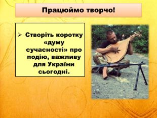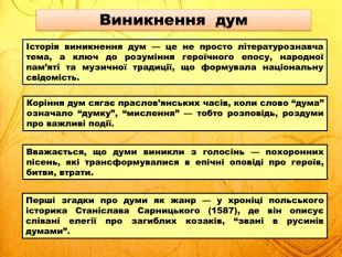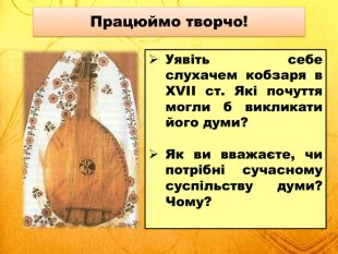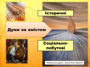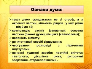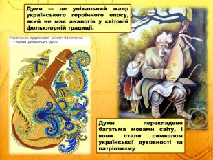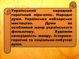 Презентація «Український народний героїчний ліро-епос. Народні думи. Українське кобзарське мистецтво. Думи як особливий жанр українського фольклору» створена до уроку української літератури у 8 класі НУШ. Робота містить матеріали, які можуть допомогти учителю в підготовці до уроку.