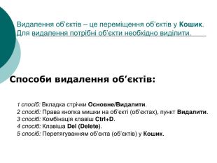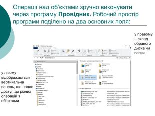 Слайди презентації містять перевірені практикою графічні схеми та екранні скріни, які наочно представляють і допомагають краще запам’ятати, узагальнити і систематизувати інформацію, що стосується управління папками, файлами, ярликами у Windows 10.