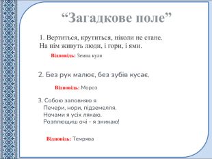 1. Вертиться, крутиться, ніколи не стане. На нім живуть люди, і гори, і ями.“Загадкове поле”Відповідь: Мороз. Відповідь: Земна куля2. Без рук малює, без зубів кусає. Відповідь: Темрява3. Собою заповняю я Печери, нори, підземелля. Ночами я усіх лякаю. Розплющиш очі - я зникаю!