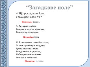 4. Що росте, коли їсть,і помирає, коли п'є?“Загадкове поле”Відповідь: Вітер. Відповідь: Вогонь5. Без крил, а літає,Без рук, а ворота відчиняє,Без голосу, а завиває. Відповідь: Вулкан6. Я - велетень, спокійно сплю,Та лиш прокинусь я від сну,Гучно кашляю і чхаю,Все довкола я здригаю,Небо димом наповняюІ вогонь я вивергаю.