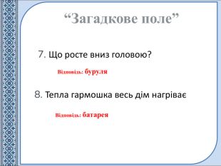 “Загадкове поле”Відповідь: буруля7. Що росте вниз головою?Відповідь: батарея8. Тепла гармошка весь дім нагріває