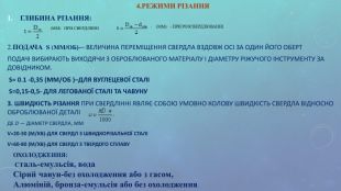 4.РЕЖИМИ РІЗАННЯ ГЛИБИНА РІЗАННЯ: (ММ) ПРИ СВЕРДЛІННІ 2.ПОДАЧА S (ММ/ОБ)-– ВЕЛИЧИНА ПЕРЕМІЩЕННЯ СВЕРДЛА ВЗДОВЖ ОСІ ЗА ОДИН ЙОГО ОБЕРТ ПОДАЧІ ВИБИРАЮТЬ ВИХОДЯЧИ З ОБРОБЛЮВАНОГО МАТЕРІАЛУ І ДІАМЕТРУ РІЖУЧОГО ІНСТРУМЕНТУ ЗА ДОВІДНИКОМ. S= 0.1 -0,35 (ММ/ОБ )–ДЛЯ ВУГЛЕЦЕВОЇ СТАЛІ S=0,15-0,5- ДЛЯ ЛЕГОВАНОЇ СТАЛІ ТА ЧАВУНУ 3. ШВИДКІСТЬ РІЗАННЯ ПРИ СВЕРДЛІННІ ЯВЛЯЄ СОБОЮ УМОВНО КОЛОВУ ШВИДКІСТЬ СВЕРДЛА ВІДНОСНО ОБРОБЛЮВАНОЇ ДЕТАЛІ ДЕ D — ДІАМЕТР СВЕРДЛА, ММ V=20-30 (М/ХВ)-ДЛЯ СВЕРДЛ З ШВИДКОРІЗАЛЬНОЇ СТАЛІ V=60-80 (М/ХВ)-ДЛЯ СВЕРДЛ З ТВЕРДОГО СПЛАВУ ОХОЛОДЖЕННЯ: Сталь-емульсія, вода Сірий чавун-без охолодження або з гасом, Алюміній, бронза-емульсія або без охолодження.
