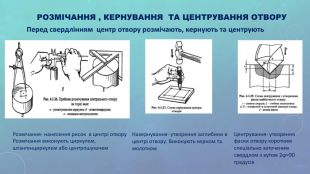 РОЗМІЧАННЯ , КЕРНУВАННЯ ТА ЦЕНТРУВАННЯ ОТВОРУ Розмічання- нанесення рисок в центрі отвору Розмічання виконують циркулем, штангенциркулем або центрошукачем Накернування- утворення заглибини в центрі отвору. Виконують керном та молотком Центрування- утворення фаски отвору коротким спеціально заточеним свердлом з кутом 2ϕ=90 градусів Перед свердлінням центр отвору розмічають, кернують та центрують