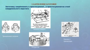 2.ЗАКРІПЛЕННЯ ЗАГОТОВКИ Трикулачкові патрони машинні лещата Призми з прихватами Кондуктор Заготовку закріплюють в пристосуванні , а пристосування-на столі свердлильного верстата