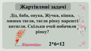 Жартівливі задачіДід, баба, онука, Жучка, кішка, мишка тягли, тягли ріпку нарешті витягли. Скільки очей побачили ріпку?Відповідь:2*6=12