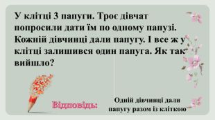 У клітці 3 папуги. Троє дівчат попросили дати їм по одному папузі. Кожній дівчинці дали папугу. І все ж у клітці залишився один папуга. Як так вийшло? Відповідь: Одній дівчинці дали папугу разом із кліткою