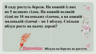 В саду ростуть берези. На кожній із них по 5 великих гілок. На кожній великій гілці по 10 маленьких гілочок, а на кожній маленькій гілочці – по 1 яблуку. Скільки яблук росте на цьому дереві? Відповідь: Яблука на березах не ростуть