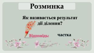Розминка. Як називається результат дії ділення?Відповідь:частка
