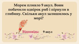 Морем пливло 9 акул. Вони побачили одвірок риб і пірнули в глибину. Скільки акул залишилось у морі?Відповідь: 9 акул