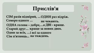 Прислів'я. СІМ разів відміряй, …Семеро одного …ОДИН раз відріж.не чекають. ОДНА голова – добре,…Старий друг…Один за всіх, …Сім п'ятниць...а ДВІ - краще.краще за нових двох.і всі за одногона тиждень.