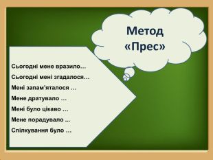 Метод «Прес» Сьогодні мене вразило… Сьогодні мені згадалося… Мені запам’яталося … Мене дратувало … Мені було цікаво … Мене порадувало ... Спілкування було …