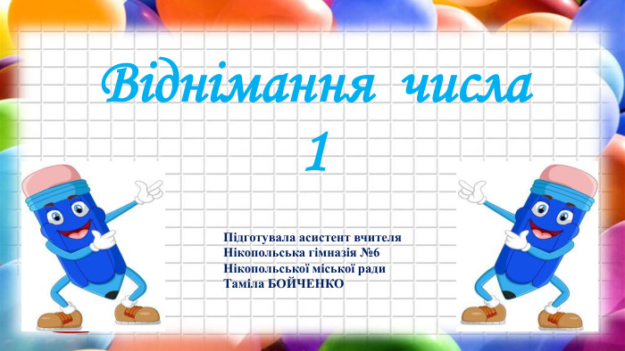 Віднімання числа 1 Підготувала асистент вчителя Нікопольська гімназія №6 Нікопольської міської ради. Таміла БОЙЧЕНКО