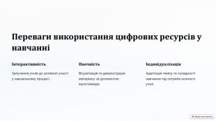 Переваги використання цифрових ресурсів у навчанніІнтерактивність. Залучення учнів до активної участі у навчальному процесі. Наочність. Візуалізація та демонстрація матеріалу за допомогою мультимедіа.Індивідуалізація. Адаптація темпу та складності навчання під потреби кожного учня.