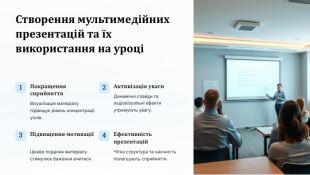 Створення мультимедійних презентацій та їх використання на уроці1 Покращення сприйняття. Візуалізація матеріалу підвищує рівень концентрації учнів.2 Активізація уваги. Динамічні слайди та аудіовізуальні ефекти утримують увагу.3 Підвищення мотиваціїЦікаве подання матеріалу стимулює бажання вчитися.4 Ефективність презентацій. Чітка структура та наочність полегшують сприйняття.