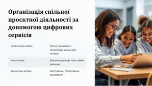 Організація спільної проєктної діяльності за допомогою цифрових сервісів. Колективна робота. Спільні документи, презентації, дошки для нотаток. Комунікація. Відеоконференції, чати, обмін файлами. Зворотний зв'язок. Опитування, голосування, оцінювання