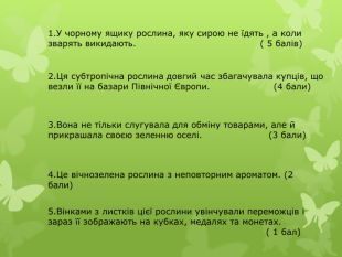 1. У чорному ящику рослина, яку сирою не їдять , а коли зварять викидають. ( 5 балів)2. Ця субтропічна рослина довгий час збагачувала купців, що везли її на базари Північної Європи. (4 бали)3. Вона не тільки слугувала для обміну товарами, але й прикрашала своєю зеленню оселі. (3 бали)4. Це вічнозелена рослина з неповторним ароматом. (2 бали)5. Вінками з листків цієї рослини увінчували переможців і зараз її зображають на кубках, медалях та монетах. ( 1 бал)