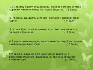 1. В чорному ящику плід рослини, який за легендами тричі корінним чином вплинув на історію людства. ( 5 балів)2. Рослини, що дають ці плоди маютьсотні різноманітних сортів. ( 4 бали)3.Їх полюбляють усі за соковитість, різні смакові якості, та довге зберігання ( 3 бали)4. З них готують варення, варять компоти, виробляють один з найпопулярніших соків. ( 2 бали)5. У казках наливний плід котиться по тарілочці з блакитною смужкою і відкриває усі таємниці минулого і майбутнього. ( 1 бал)