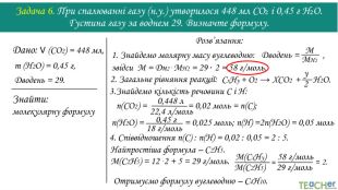 У презентації розглянуто методику визначення молекулярної формули вуглеводню за результатами реакції її повного згоряння. Учні дізнаються, як за масою утвореного вуглекислого газу та води обчислити кількість атомів Карбону й Гідрогену. Покроково показано розрахунки за рівнянням реакції, співвідношення кількостей речовин і обчислення найпростішої та молекулярної формули. Матеріал подано у наочній, логічній формі з прикладами задач і роз’ясненням типових помилок, що допомагає учням закріпити практичні навички роботи з хімічними рівняннями й стехіометричними обчисленнями.