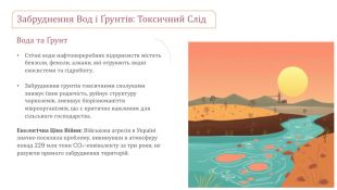 Забруднення Вод і Ґрунтів: Токсичний Слід. Вода та Ґрунт. Стічні води нафтопереробних підприємств містять бензоли, феноли, алкани, які отруюють водні екосистеми та гідробіоту. Забруднення ґрунтів токсичними сполуками знижує їхню родючість, руйнує структуру чорноземів, зменшує біорізноманіття мікроорганізмів, що є критично важливим для сільського господарства. Екологічна Ціна Війни: Військова агресія в Україні значно посилила проблему, викинувши в атмосферу понад 229 млн тонн CO₂-еквіваленту за три роки, не рахуючи прямого забруднення територій.