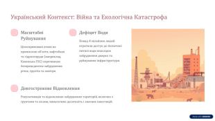Український Контекст: Війна та Екологічна Катастрофа. Масштабні Руйнування. Цілеспрямовані атаки на промислові об’єкти, нафтобази та гідроспоруди (наприклад, Каховська ГЕС) спричинили безпрецедентне забруднення річок, ґрунтів та повітря. Дефіцит Води. Понад 4 мільйони людей втратили доступ до безпечної питної води внаслідок забруднення джерел та руйнування інфраструктури. Довгострокове Відновлення. Рекультивація та відновлення забруднених територій, включно з ґрунтами та лісами, вимагатиме десятиліть і значних інвестицій.
