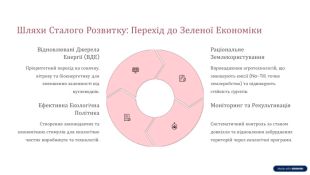 Шляхи Сталого Розвитку: Перехід до Зеленої Економіки. Відновлювані Джерела Енергії (ВДЕ)Пріоритетний перехід на сонячну, вітрову та біоенергетику для зменшення залежності від вуглеводнів. Раціональне Землекористування. Впровадження агротехнологій, що зменшують емісії (No-Till, точне землеробство) та підвищують стійкість ґрунтів. Моніторинг та Рекультивація. Систематичний контроль за станом довкілля та відновлення забруднених територій через екологічні програми. Ефективна Екологічна Політика. Створення законодавчих та економічних стимулів для екологічно чистих виробництв та технологій.