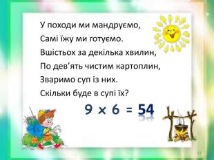 У походи ми мандруємо,Самі їжу ми готуємо. Вшістьох за декілька хвилин,По дев’ять чистим картоплин,Зваримо суп із них. Скільки буде в супі їх? 9 х 6 =5413