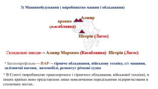 * В Єгипті (виробництво транспортного і гірничого обладнання, військової техніки), в інших країнах воно представлене лише невеличкими передільними підприємствами в столичних містах. 3) Машинобудування ( виробництво машин і обладнання)* Багатопрофільне→ ПАР→ гірниче обладнання, військову техніку, с/г машини, залізничні вагони, автомобілі, ремонтує річкові судна