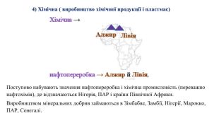Поступово набувають значення нафтопереробка і хімічна промисловість (переважно нафтохімія), де відзначаються Нігерія, ПАР і країни Північної Африки. Виробництвом мінеральних добрив займаються в Зімбабве, Замбії, Нігерії, Марокко, ПАР, Сенегалі.4) Хімічна ( виробництво хімічної продукції і пластмас)
