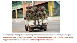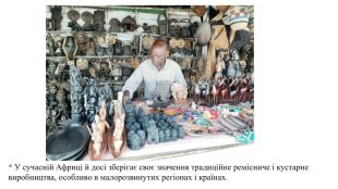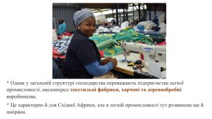 * Традиційними і подекуди основними напрямками виробництва в африканських країнах залишаються текстильна і харчова. * У текстильній промисловості провідна роль належить бавовняній на власній сировині, а також виробництву синтетичних волокон.5) Легка ( виробництво тканин, одягу, взуття)