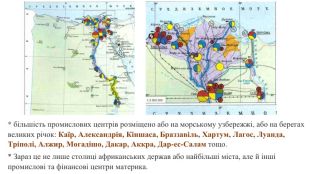 * більшість промислових центрів розміщено або на морському узбережжі, або на берегах великих річок: Каїр, Александрія, Кіншаса, Браззавіль, Хартум, Лагос, Луанда, Тріполі, Алжир, Могадішо, Дакар, Аккра, Дар-ес-Салам тощо. * Зараз це не лише столиці африканських держав або найбільші міста, але й інші промислові та фінансові центри материка.