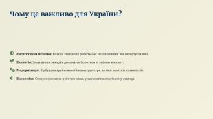 Енергетична безпека: Власна генерація робить нас незалежними від імпорту палива. Екологія: Зменшення викидів допомагає боротися зі зміною клімату. Модернізація: Відбудова зруйнованої інфраструктури на базі новітніх технологій. Економіка: Створення нових робочих місць у високотехнологічному секторі. Чому це важливо для України?