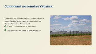 Україна має один з найвищих рівнів сонячної інсоляції в Європі. Найбільш перспективними є південні області (Одеська, Херсонська, Миколаївська). Понад 200 сонячних днів на рік на півдні. Можливість встановлення СЕС на всій території. Сонячний потенціал України