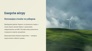 Енергія вітру. Потенціал степів та узбереж. Прибережні райони Чорного та Азовського морів, а також гірські масиви Карпат є ідеальними майданчиками для ВЕС. Постійні вітри дозволяють генерувати енергію цілодобово. Децентралізація вітрової енергетики — запорука енергетичної стійкості громад.