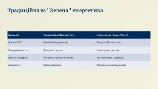 {ECFD972 B-47 E9-4196-AC80-9 C5 B5 C46 FA1 E}Критерій. Традиційна (Вугілля/Газ)Кліматична (Сонце/Вітер)Викиди CO2 Високі (Забруднення)Відсутні (Екологічно)Відновлюваність. Вичерпні ресурси. Невичерпні ресурси. Вартість ресурсу. Потрібно купувати паливо. Безкоштовно (Природа)Залежність. Централізована. Можлива децентралізація. Традиційна vs "Зелена" енергетика