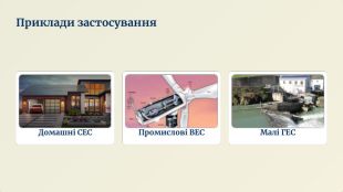 Домашні СЕСПромислові ВЕСМалі ГЕСПриклади застосування