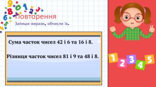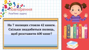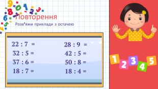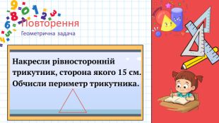 Ця презентація з математики присвячена повторенню вивченого матеріалу. У ній подано приклади на ділення з остачею, задачі на зведення до одиниці та вправи на знаходження периметра рівностороннього трикутника. Матеріал допоможе закріпити навички обчислень, логічного мислення та застосування знань на практиці.