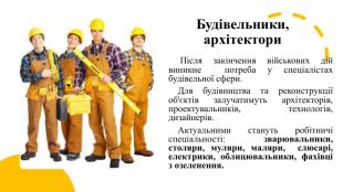 Будівельники, архітектори Після закінчення військових дій виникне потреба у спеціалістах будівельної сфери. Для будівництва та реконструкції об'єктів залучатимуть архітекторів, проектувальників, технологів, дизайнерів. Актуальними стануть робітничі спеціальності: зварювальники, столяри, муляри, маляри, слюсарі, електрики, облицювальники, фахівці з озеленення.