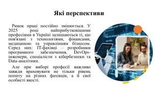 Які перспективи Ринок праці постійно змінюється. У 2025 році найприбутковішими професіями в Україні залишаються ті, що пов'язані з технологіями, фінансами, медициною та управлінням бізнесом. Серед них: IT-фахівці – розробники програмного забезпечення, Dev. Ops-інженери, спеціалісти з кібербезпеки та Data-аналітики. Але при виборі професії важливо завжди враховувати не тільки рівень попиту на різних фахівців, а й свої особисті якості.