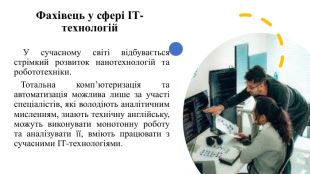 Фахівець у сфері ІТ-технологій У сучасному світі відбувається стрімкий розвиток нанотехнологій та робототехніки. Тотальна комп’ютеризація та автоматизація можлива лише за участі спеціалістів, які володіють аналітичним мисленням, знають технічну англійську, можуть виконувати монотонну роботу та аналізувати її, вміють працювати з сучасними ІТ-технологіями.