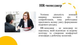 Менеджер з продажу Ключова мета діяльності будь-якої компанії - отримання прибутку шляхом продажу своїх товарів або послуг. Менеджер з продажу працює безпосередньо з клієнтом, тому повинен відмінно володіти навичками комунікації, мати чітку та правильну мову, вміти працювати з великими обсягами інформації та базовими програмами ПК, бути стійким до стресу та цілеспрямованим.